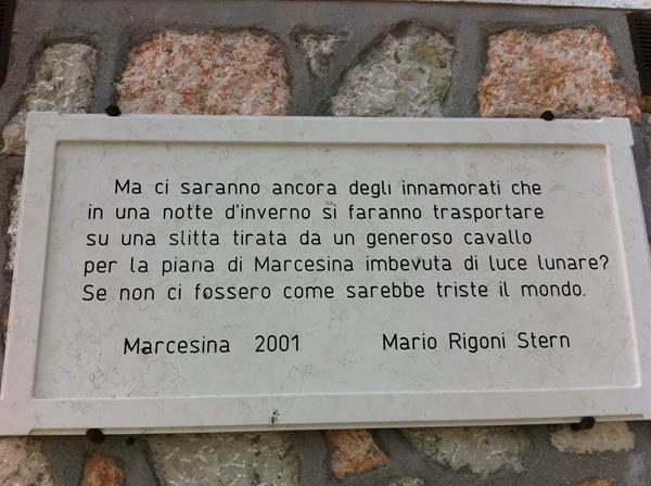 Il primo brano citato compare in una targa sul muro dell’Albergo Marcesina, e riporta la frase finale della prefazione scritta da Mario Rigoni Stern al catalogo di una mostra organizzata da Maria Teresa e Ivo Baldisseri, proprietari dell’albergo Marcesina e di un museo delle slitte a Carmignano di Brenta (Pd).