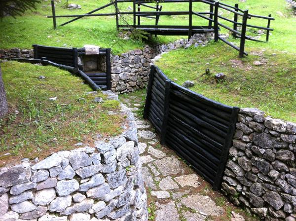 Dopo aver parcheggiato nei pressi di malga Zebio (m. 1.670) si imbocca il sentiero verso est che in poche decine di metri sale alla Crocetta (1.708), dove ci sono le postazioni e trincee restaurate. Da qui si scende agevolmente con la mulattiera verso la mina di Scalambron (m. 1.677 – esplosa forse per un fulmine l’8 giugno 1917, uccidendo 120 soldati della Brigata Catania che erano in perlustrazione in vista dell’imminente attacco all’Ortigara), quindi il rifugio Stalder dov’è ricostruita una trincea didattica e c’è il suggestivo cimitero militare della Brigata Sassari (m. 1.575), che qui scrisse coi suoi “Diavoli rossi” una delle sue pagine più gloriose e sanguinose.